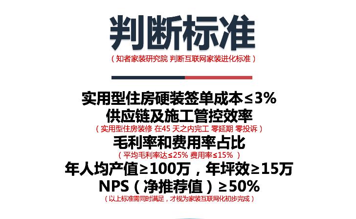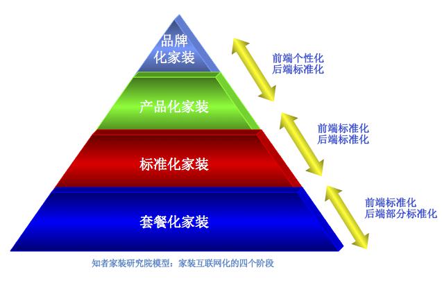 以上標準需同時滿足,才視為家裝互聯網化的進化達到了高級階段。根據知者家裝研究院的理論模型,五個維度的數值背后是前端和后端的標準化程度。