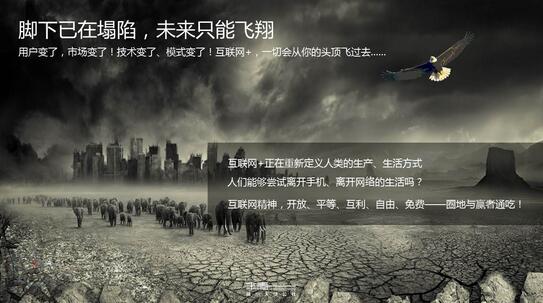 這個畫面也是好萊塢電影片里面的,地震、海嘯來了,沙石飛走,大家都努力避開的那個災難場景。現實中,我們只有很短的時間之內要起飛,假如沒有這種心態的話,我認為有問題,因為循序漸進的這種思維是會影響創新的。我們今天做任何的創新創業,沒有做好充分的準備的話,最后你會跟著這個地蹋下去。