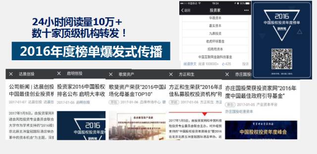2017年1月5日,投資家網(wǎng)主辦的千人大會(huì)“變革中的資本機(jī)會(huì)”中國股權(quán)投資年度峰會(huì)暨2016投資家網(wǎng)年會(huì)引起了業(yè)界的廣泛關(guān)注,現(xiàn)場(chǎng)邀請(qǐng)了50多位來自政府及投資圈知名機(jī)構(gòu)的高管進(jìn)行主題演講,更有1500名來自投資圈、金融圈、企業(yè)圈、政府圈等領(lǐng)域的高管及負(fù)責(zé)人參加會(huì)議,同時(shí)投資家網(wǎng)頒布的中國股權(quán)投資年度榜獲得上百家頂級(jí)投資機(jī)構(gòu)轉(zhuǎn)發(fā)。