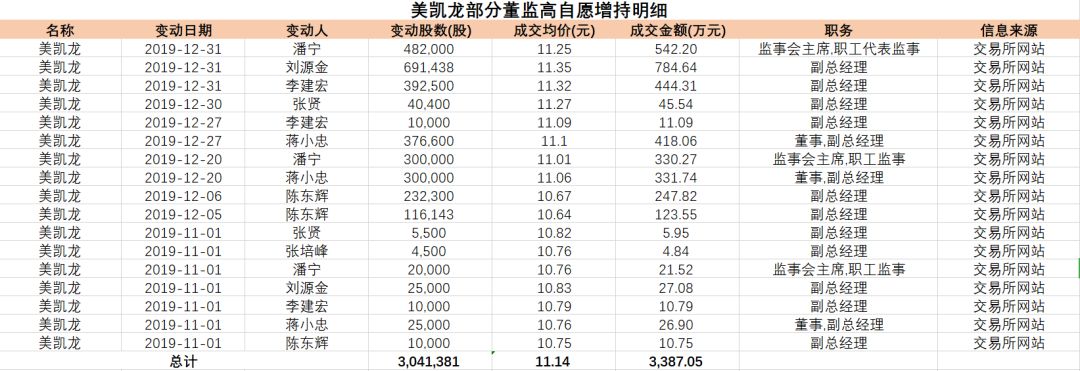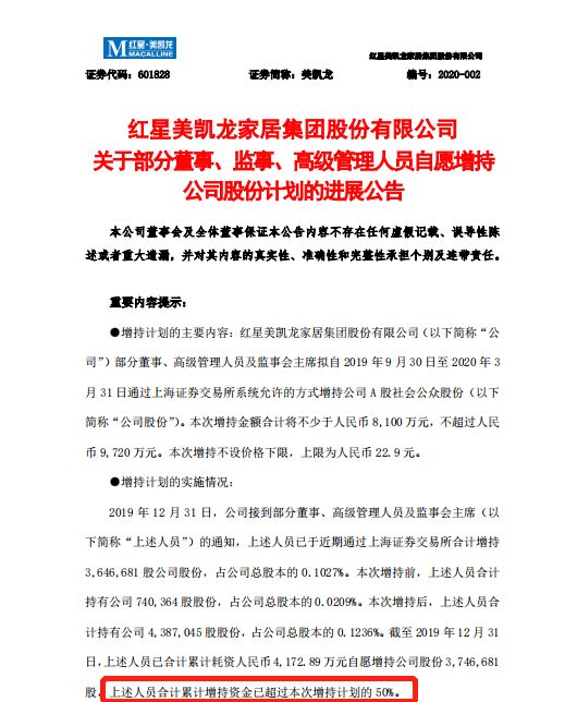 1月3日,紅星美凱龍(601828.SH,01528.HK)發布了《關于部分董事、監事、高級管理人員自愿增持公司股份計劃的進展公告》,根據公告顯示,截至2019 年12月31日,相關人員通過集中競價方式合計耗資人民幣4,172.89萬元自愿增持公司股份3,746,681股,合計增持資金已超過增持計劃的50%。