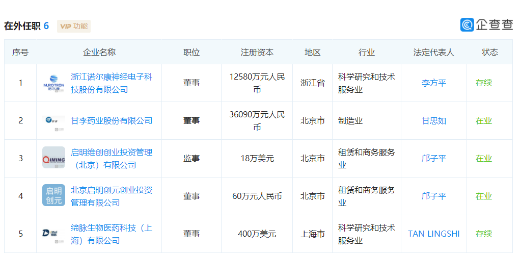 而且,她目前是浙江諾爾康神經(jīng)電子科技股份有限公司、甘李藥業(yè)股份有限公司、啟明維創(chuàng)創(chuàng)業(yè)投資管理(北京)有限公司、北京啟明創(chuàng)元?jiǎng)?chuàng)業(yè)投資管理有限公司、締脈生物醫(yī)藥科技(上海)有限公司的董事、監(jiān)事。