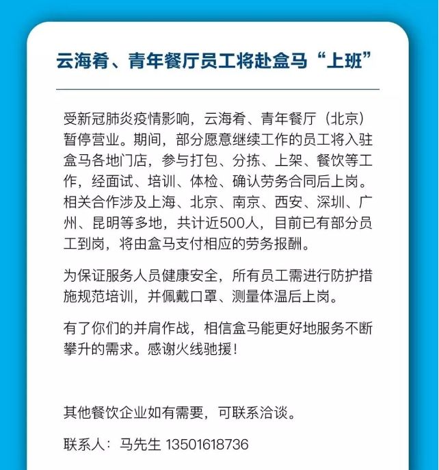 2月3日,盒馬官方微博發(fā)布消息稱,疫情期間聯(lián)合知名餐飲企業(yè)進行合作,采用勞務(wù)用工方式,接收云海肴、青年餐廳(北京)部分員工,入駐盒馬各地門店,參與打包、分揀、上架、餐飲等工作;相關(guān)合作涉及上海、北京、西安、深圳、廣州、昆明多地,共計500人;目前已有部分員工到崗。盒馬將支付相應(yīng)的勞務(wù)報酬。