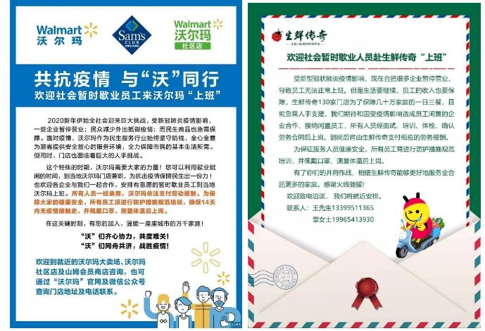 除此之外,沃爾瑪、永輝、超市發(fā)、生鮮傳奇、金虎便利等也已經(jīng)紛紛發(fā)出號召,歡迎目前友商和鄰業(yè)暫停營業(yè)的閑置員工來公司“上班”。