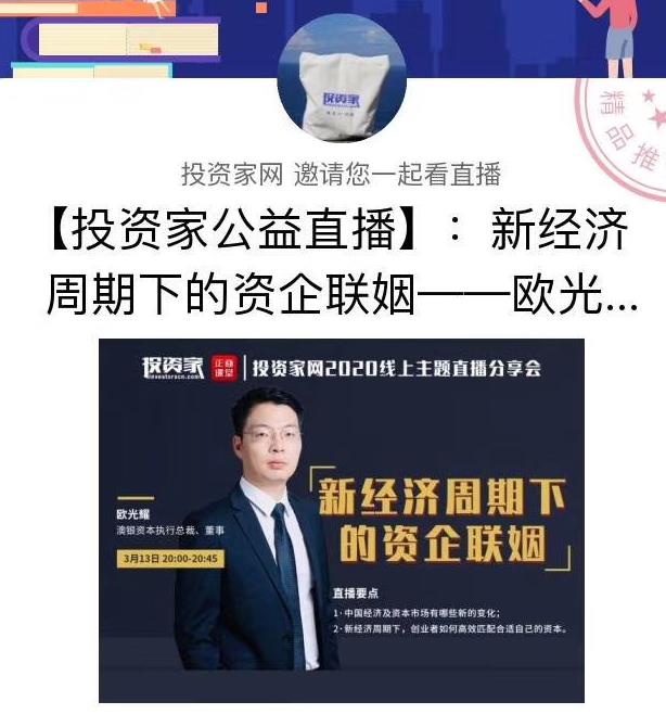 本期,我們圍繞“聚資本之勢,解產業之困”展開,后續還有精彩內容等待大家。3月13日晚8點,澳銀資本執行總裁、董事歐光耀先生在投資家網·正商課堂直播間,帶來“新經濟周期下的資企聯姻”的直播分享。