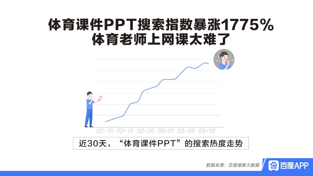 以百度為例,最早作為搜索引擎以內容的模式切入教育領域,百度文庫,百度知道,百度百科是中文互聯網的老牌教育平臺產品。至今,它們還承擔著響應用戶知識需求的部分責任,例如,按教育搜索大數據報告的說法,百度文庫里體育課件PPT此次幫助了很多對“網課”手足無措的體育老師。