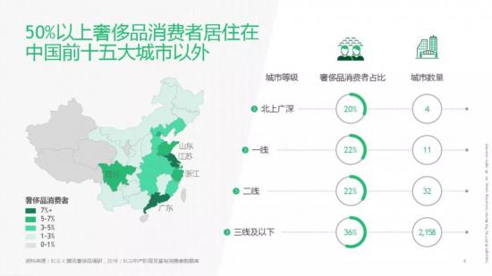 騰訊廣告和波士頓咨詢公司聯合發布的《2019中國奢侈品消費者數字行為報告》顯示,一半以上的奢侈品消費者居住在中國前十五大城市之外: