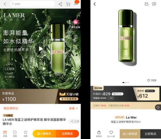 左:天貓旗艦店 右:萬里目 海藍之謎修護精粹液