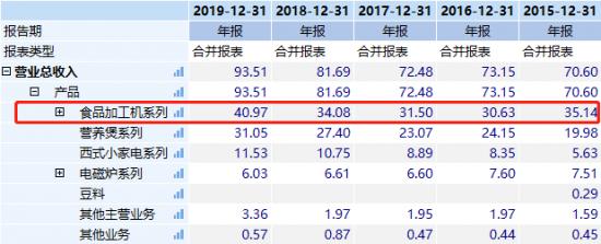 其中,最主要的營收來自于食品加工機系列,其實就是豆漿機業務,占到了2019年整體營收的43.81%;其次是營養煲系列,占比達到33.2%。
