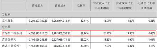 相比于2018年41.73%的占比,九陽在食品加工機系列上所占的比重進一步被拉大,同比增減幅度為20.2%,也就是說以豆漿機為主的產品在集團內的地位進一步強化了。