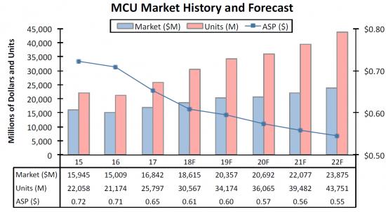 2019~2022年全球MCU市場規(guī)模及出貨量預測。(來源:ICInsights)