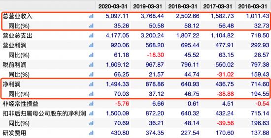 從整體業績來看,阿里在2020財年(自然年2019年4月~2020年3月)實現營收5097.11億元(人民幣,下同),達成財年收入指標,同比增長35%,凈利潤1494.33億元,同比增長70%,均超出市場預期。