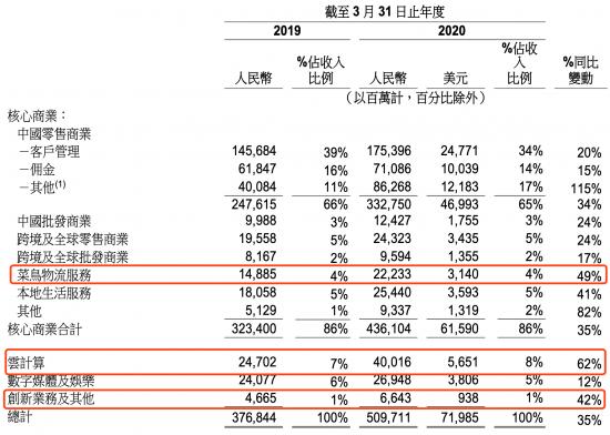 從分類來看,核心商業部分占比達到86%,是阿里的現金奶牛,實際上包括了淘寶和天貓、1688.com、速賣通、菜鳥、海外電商LAZADA、餓了么等業務線。