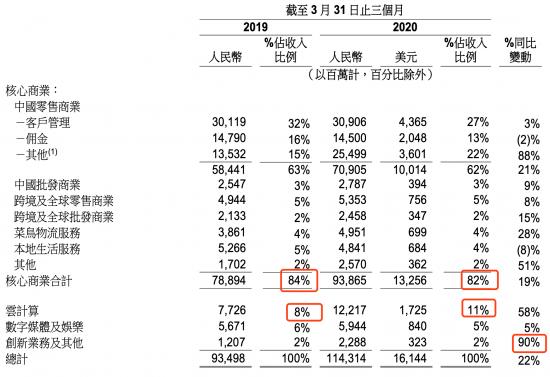 其中,核心商業中的“其他”項目,包括飛豬、阿里影業、大麥及高德在內的業務,即便是疫情期間仍然得到了51%的增速,而包括在線游戲、高德、天貓精靈等業務在內的創新業務,同比增速達到了90%,營收結構在朝著多元化的方向移動,說明下注未來的比例在增加。