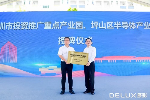 坪山區(qū)副區(qū)長陳華平為多彩科技園授“坪山半導體產(chǎn)業(yè)園”牌匾。