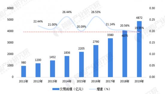 2011—2019年中國智慧物流交易規(guī)模及增速情況(單位:億元,%)