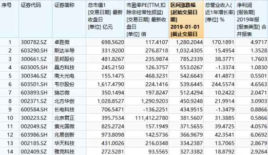 市值超過1600億的韋爾股份,凈利潤僅為4.6億;漲幅最大的卓勝微,市值2019年凈利潤4.9億;科創板市值超1000億的中微公司,2019年凈利潤1.88億,市盈率超過了800倍;漲幅超過30%的達到45家,而近1年營收增速超過30%的僅有14家。