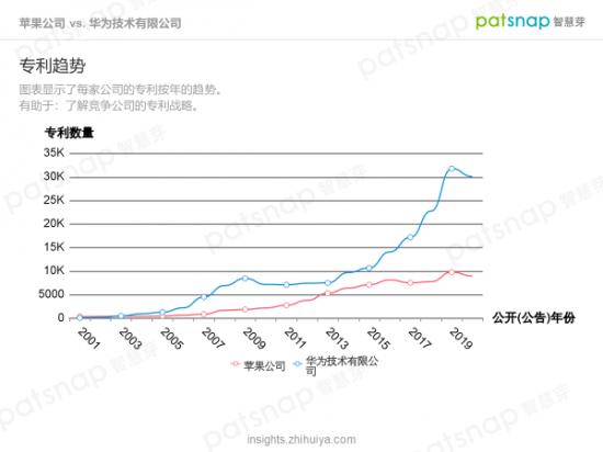 從專利趨勢的維度也可以看出,蘋果專利公開(公告)數量的年增長是一條比較平緩的上升曲線,而華為的專利總量自2003年超過蘋果后,從2013年開始,其增長曲線被陡然拉直,后來居上不說,還逐漸甩開了與蘋果的差距。