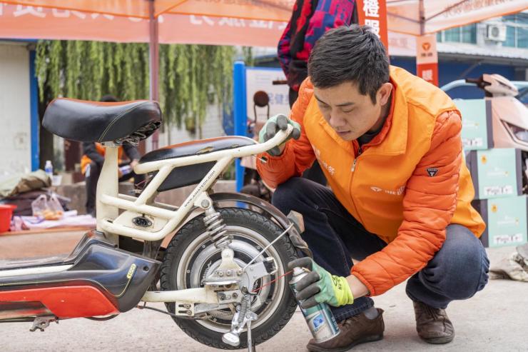 雅迪暖橙小哥進行車輛保養
