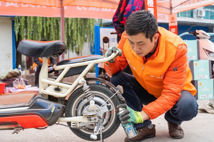 雅迪“暖橙小哥”在為用戶檢修電動車