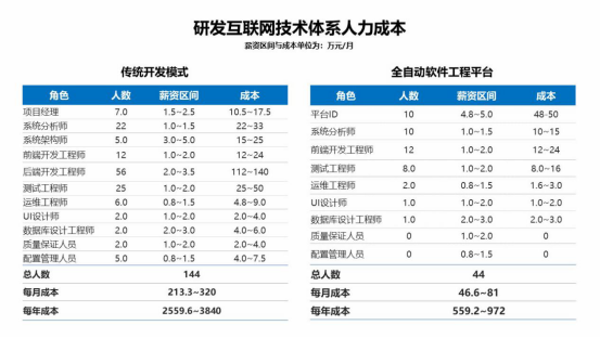 “以互聯網技術為出發點的一個小型團隊為例,經過測算大概需要25人,這一年的平均工資就需要400萬至500萬左右,隨著項目的不斷增加,人員需求擴充,成本還會不斷攀升。”有著二十多年軟件開發從業經驗的飛算云智總裁陳定瑋這樣說道。