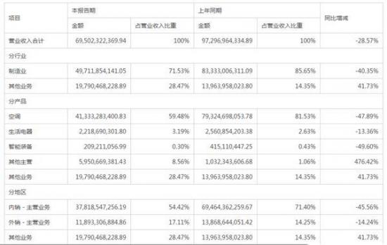 根據其2020年中報顯示,目前空調和生活電器仍然是格力的營收支柱,2019年上半年這兩項業務營收合計占比達到84.16%,今年受疫情影響,上半年空調和生活電器業務營收合計占比有所下滑,但也達到63.67%。