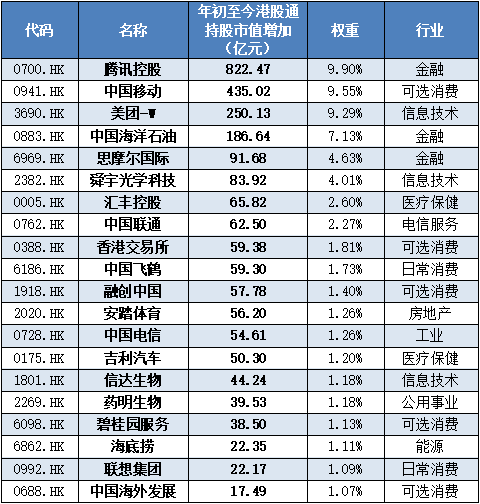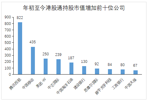 年初至今,南下資金增倉金額前三位的公司為騰訊控股、中國移動和美團(tuán),分別增倉822億元、435億元和250億元,均為港股通100指數(shù)的權(quán)重股。