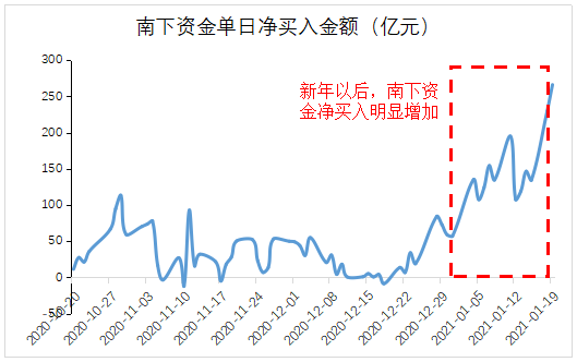 摘要:2021新年以來,南下資金爆發(fā)式流入港股。年初至今,港股通凈流入規(guī)模已超過1800億港元,帶動港股市場上行。