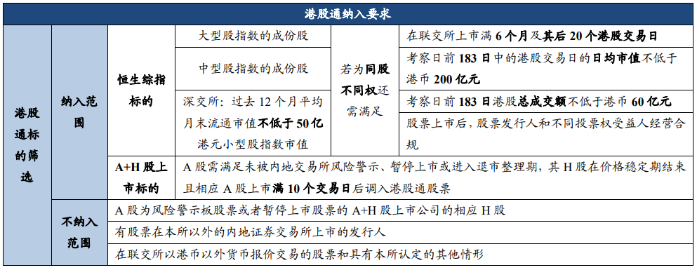 1)成為恒生綜合指數(shù)成分股:包括恒生綜合大型股指數(shù)成分股、恒生綜合中型股指數(shù)成分股。同時深交所允許過去12個月平均月末流通市值不低于50億港元的恒生綜合小型股指數(shù)成分股納入深港通。