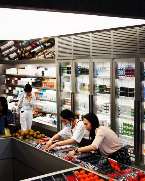 譬如HARMAY 話梅的首店,它位于上海市中心前法租界的黃金地段安福路。門店外觀沒有明顯LOGO,唯有透明的聚碳酸酯面板層層覆蓋在原有墻面,低調地表達著品牌的倉儲設計語言。