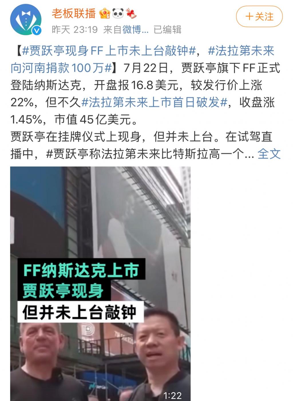 昨天上市現場,賈躍亭作為 FF 公司創始人、首席產品及用戶生態官出席慶祝活動,他在社交軟件激動表示: