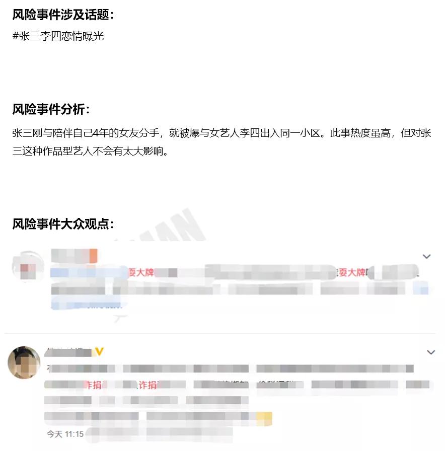 下面我們以藝人張三(虛構人物)為例介紹藝人風險盡調服務的內容(此處僅以極端事件舉例)。愛豆出身的張三自5月起就與女生傳出緋聞 ,并且引發部分網友的討論。在7月份拍攝電影期間,由于張三耍大牌 和拒不配合宣傳違反合同 ,引發更多人的關注熱議。正當全民“吃瓜”時,又有網友扒出了此前張三可能存在詐捐 的情況。那么,對品牌方而言,藝人張三究竟有多大的風險值呢?