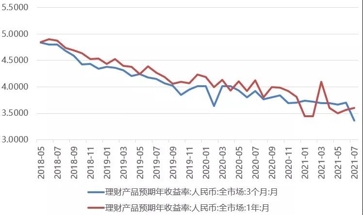 在大資管時代的背景下,政策監管標準趨于統一,各類金融機構與外資巨頭同臺競技。其中信托和銀行理財等傳統金融機構業務調整節奏加快,自2018年資管新規出臺后,各類銀行理財產品的發行數量呈現出下降趨勢,根據Wind統計,截至2021年8月,保本固定型和保本浮動型理財產品的發行數量逐漸趨零。同時,理財產品收益率水平也在持續下滑,當前全市場3個月期理財產品的平均收益率已經下滑至3.3%左右。