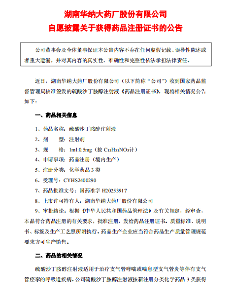 2025-04-25近日,華納藥廠(688799.SH)收到國家藥品監督管理局核準簽發的硫酸沙丁胺醇注射液《藥品注冊證書...