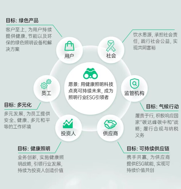 在亞運會開幕前幾天,雷士照明正式發布了ESG報告,并宣布正式構建全面、立體的ESG治理體系——在該體系下,雷士照明提出了自己的ESG愿景,并設定了6大ESG目標、5大ESG承諾和15個ESG議題。