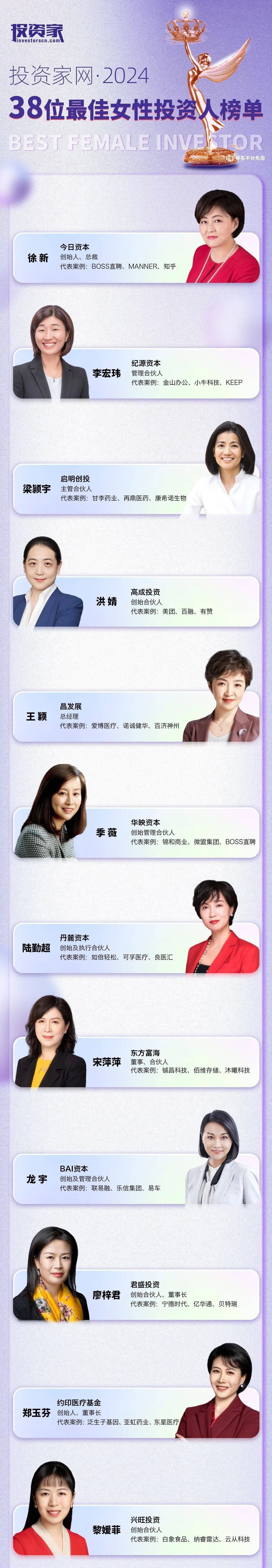 2024年3月8日,一年一度的“女神節”襲來,為表彰過去在VC/PE行業默默付出、取得成績的女性投資人,投資家網及投資家研究院決定發布“投資家網·38位最佳女性投資人榜單”。借此,激勵那些持續推動VC/PE生態健康發展,并對新經濟貢獻力量的她們。