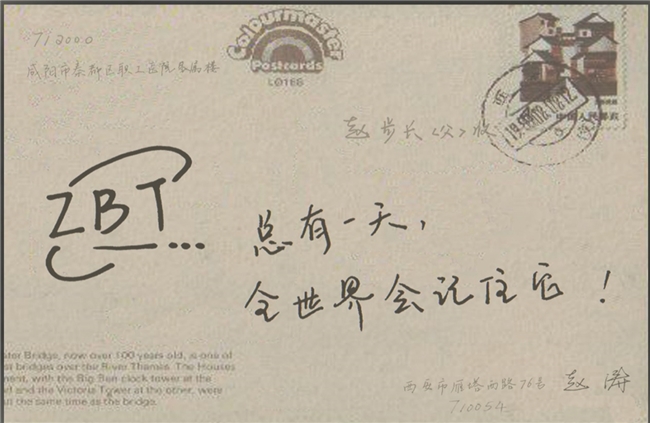 30多年前的一個夏天,一張不算精美的明信片從西安醫科大學寄往咸陽市職工醫院家屬樓,明信片上手繪著一幅針灸草圖,旁邊是一行遒勁的字:“總有一天,全世界會記住它!” “Z”是“趙”,B代表“步長”,而“T”便是“濤”。