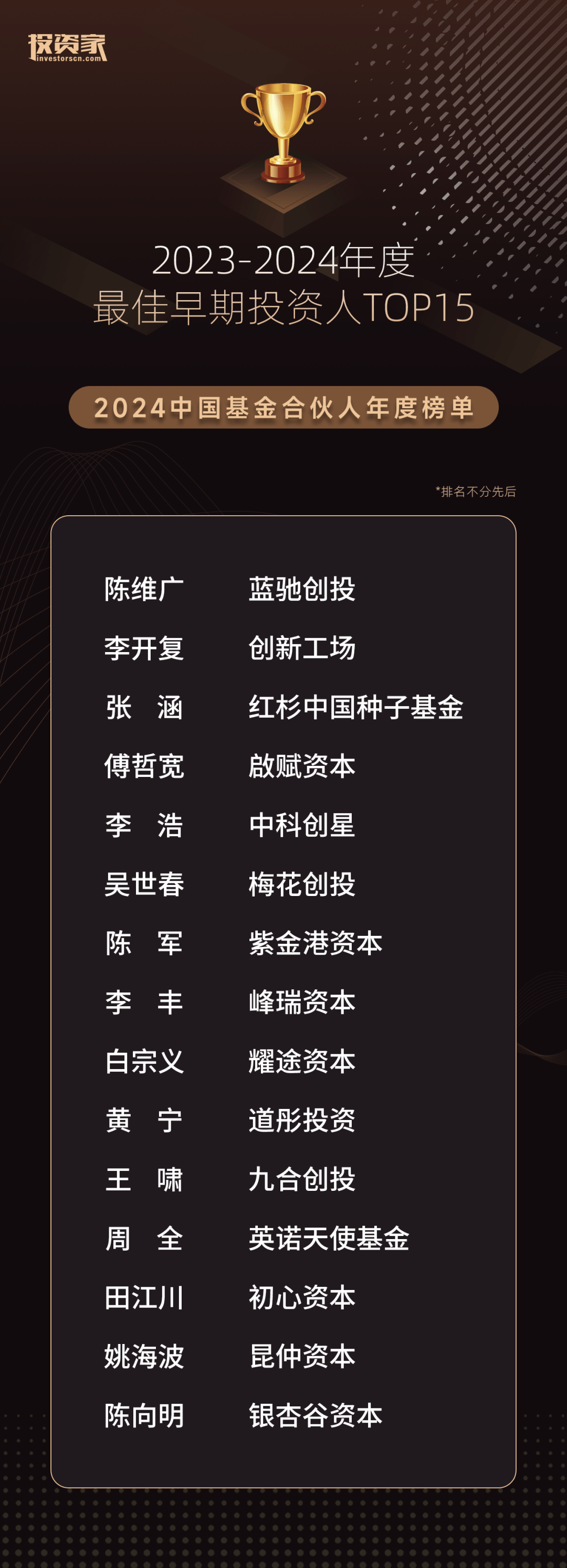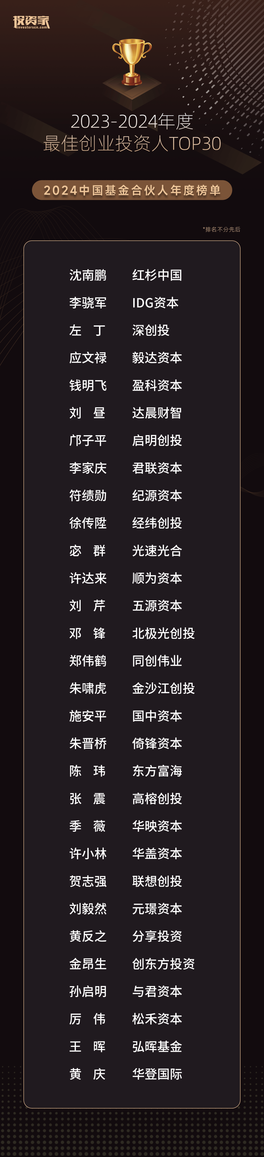 為表彰那些在新興領(lǐng)域取得優(yōu)異成績的VC/PE、產(chǎn)業(yè)資本、母基金,投資家網(wǎng)延續(xù)以往,通過問卷調(diào)研、數(shù)據(jù)核查等流程,發(fā)布“投資家網(wǎng)·2024基金合伙人年度榜單”,持續(xù)挖掘閃耀創(chuàng)投圈的機構(gòu)與個人。