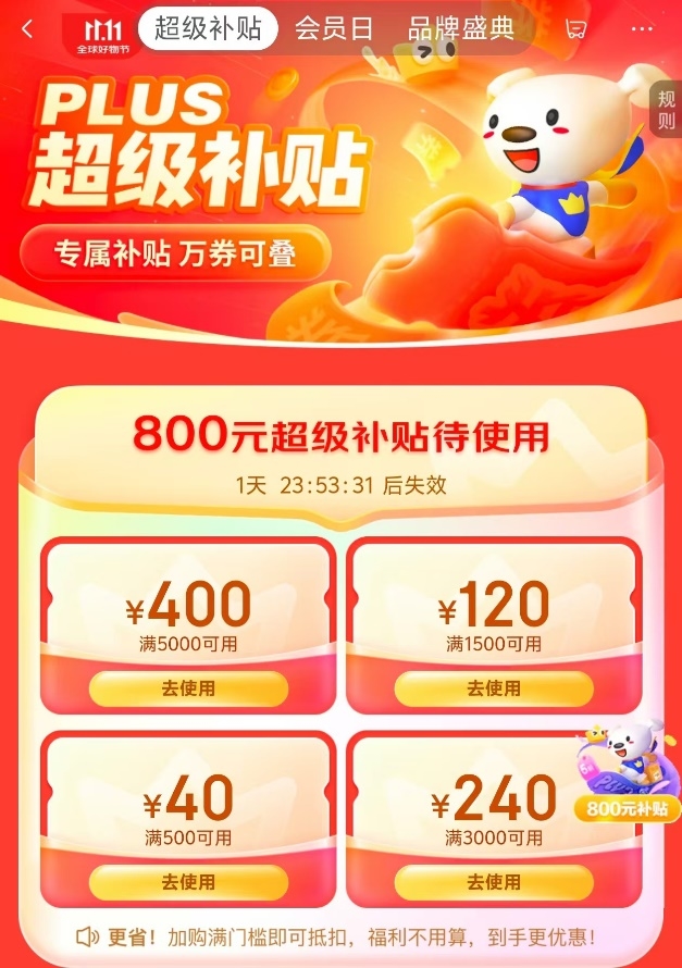 為了給廣大PLUS會員帶來“省上再省”的購物體驗,本次京東PLUS會員日有超多福利放送。即日起,PLUS會員用戶可領(lǐng)取800元超級補(bǔ)貼券,包含滿5000元減400元、滿3000元減240元、滿1500元減120元、滿500元減40元4個檔位,每檔補(bǔ)貼券領(lǐng)取時到手3張。