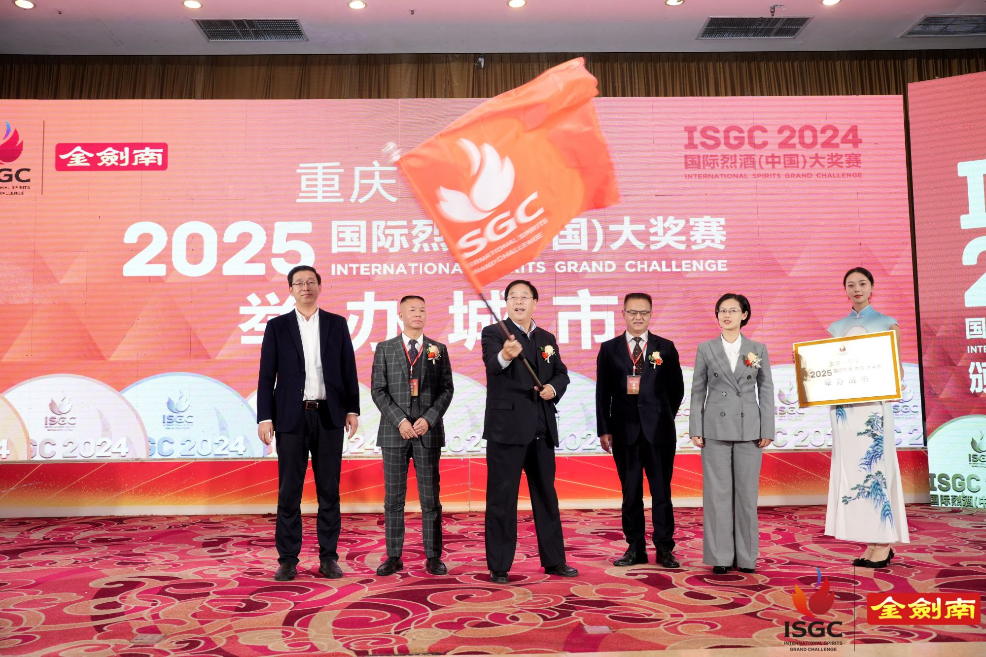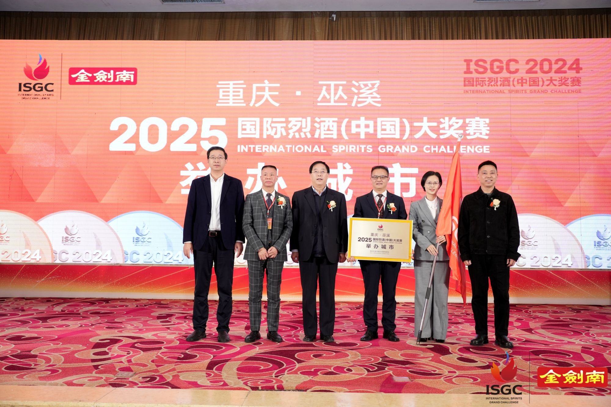 頒獎典禮最后一項,為2025ISGC國際烈酒(中國)大獎賽的舉辦地進行授旗和頒牌。首先2024ISGC國際烈酒(中國)大獎賽舉辦地政府代表文華國將大獎賽旗幟交給大獎賽組委會主任劉秀華,劉秀華交予2025ISGC國際烈酒(中國)大獎賽主辦城市重慶巫溪縣人民政府代表唐奇利;大獎賽牌匾則由中國副食流通協會酒類專業委員會會長李錦宜,交予2025ISGC國際烈酒(中國)大獎賽承辦方重慶巫溪縣人民政府代表譚仁合。