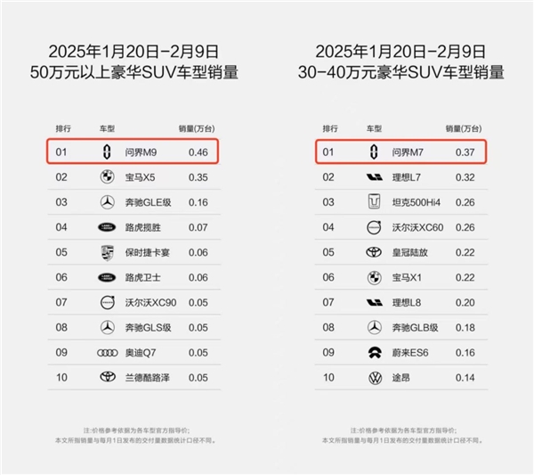 2025年第4至6周,問界系列再次登頂銷量周榜,其中,問界M9位居50萬元級及以上豪華SUV車型銷量周榜首位,問界新M7也穩坐30-40萬元豪華SUV車型銷量周榜第一。作為賽力斯與華為聯合打造的品牌,問界以“傳統豪華+科技豪華”的新豪華理念重構市場格局,推動了整個豪華車市場向智能化方向加速轉型。