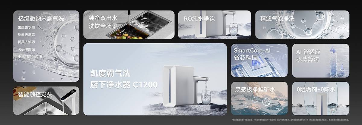 凱度定位的差異化,還體現在對用戶使用場景的深度挖掘上。以凈飲機為例,傳統產品僅滿足飲水需求,而凱度考慮到了用戶凈飲和凈洗兩方面的需求,推出霸氣洗廚下凈水器C1200,通過技術創新將凈水機的使用場景延伸至果蔬清洗、玩具清洗、洗手洗臉等。“因為微納米氣泡在破滅的時候會產生較大壓力,氣泡上升的過程中也會形成摩擦力,因此對徹底去除果蔬農殘等效果顯著。”傅平解釋道。