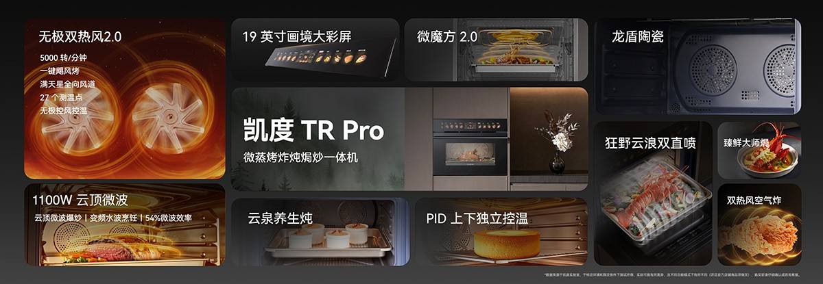 此次發布的全新凱度嵌入式微蒸烤一體機TR Pro也是如此,不僅集七大中西式烹飪技法于一身,搭載凱度首創的無極雙熱風2.0技術、DIY三段組合烹飪功能等頂尖科技,而且創新研發的“AI心動曲線”能通過獨特算法,精準控制烹飪中的溫度、濕度、火候等。