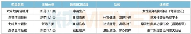 在研中藥新藥中,六味地黃苷糖片已于2025年3月提交NDA,用于治療女性更年期綜合征(腎陰虛證);烏鱉還閨顆粒、七味癸寶顆粒均已步入II期臨床,均可用于治療早發(fā)性卵巢功能不全。